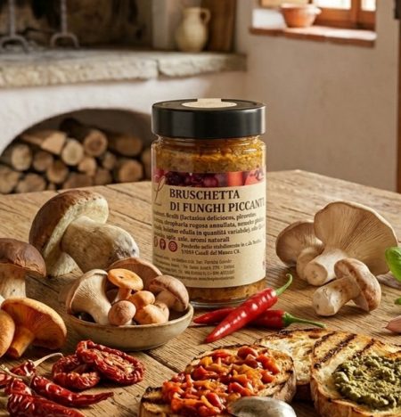 Condimento composto da un misto di funghi tra cui porcini e champignon, tagliati grossolanamente per una consistenza carnosa. Ideale come condimento per crostini caldi, panini, carni alla griglia o per arricchire primi piatti come pasta e ravioli.